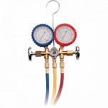 Манометрический коллектор для хладагента R-12. К штуцерам подключаются шланги для заправки хладагента или проверки давления, а вентили обеспечивают герметичность контуров и простую регулировку подачи хладагента.