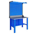 Бестумбовый. Допустимая нагрузка на столешницу 350 кг. Опорные элементы выполнены сварными из холоднокатаной стали. Для выполнения сборочных, ремонтных, слесарных, монтажных и других видов работ на производстве, в сервисных центрах, мастерских, гаражах, а также для обучения технологии в учебных заведениях. Комплектуется полкой-стенкой, расположенной под столешницей для удобного размещения габаритного инструмента и оснастки. Размеры верстака: 855x1196x696 мм. Вес: 38 кг. Поставляется в 4 комплектациях на выбор.