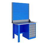 Однотумбовый. Допустимая нагрузка на столешницу 750 кг. Опорные элементы выполнены сварными из холоднокатаной стали. Верстак состоит из опоры, тумбы P7 с дверью и двумя полками и полки-стенки. Все металлические элементы покрыты полиэфирной порошковой краской. Столешница состоит из фанеры марки ФСФ толщиной 24 мм, которая покрыта лаком-антисептиком и листом оцинкованной холоднокатаной стали толщиной 1,2 мм. Размеры (ВхШхГ) 855x1196x696 мм.