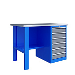 Однотумбовый. Допустимая нагрузка на столешницу 750 кг. Опорные элементы выполнены сварными из холоднокатаной стали. Верстак состоит из столешницы, опоры, тумбы P5 с четырьмя малыми и одним большим ящиком, полки-стенки, двойного экрана с кронштейнами и комплекта освещения. Все металлические элементы покрыты полиэфирной порошковой краской. Столешница из фанеры марки ФСФ толщиной 24 мм, которая покрыта лаком-антисептиком и листом оцинкованной холоднокатаной стали толщиной 1,2 мм. Размеры (ВхШхГ) 1965x1196x696 мм.