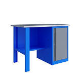 Однотумбовый. Допустимая нагрузка на столешницу 750 кг. Опорные элементы выполнены сварными из холоднокатаной стали. Верстак состоит из столешницы, опоры, тумбы P7 с дверью, полки-стенки и одинарного экрана с кронштейнами. Все металлические элементы покрыты полиэфирной порошковой краской. Столешница состоит из фанеры марки ФСФ толщиной 24 мм, которая покрыта лаком-антисептиком и листом оцинкованной холоднокатаной стали толщиной 1,2 мм. Размеры (ВхШхГ) 1470x1196x696 мм.