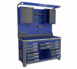 Нагрузка на столешницу 1500 кг. Столешница из листа влагостойкой фанеры марки ФСФ толщиной 40 мм и листом горячекатаной стали толщиной 5 мм. Рама верстака выполнена их холоднокатаной стали. Модуль верстака выполнен сварными. Ящики в модулях устанавливаются на шариковых телескопических направляющих полного выдвижения. Квадратная перфорация для установки крючков, держателей. Размеры: 1982x1493x743 мм