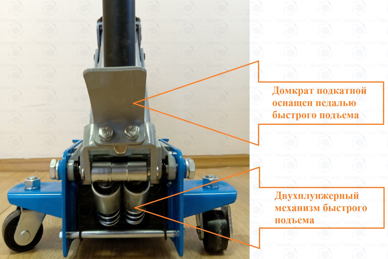 Увеличенный диаметр металлических колес домкрата Ǿ-86мм, позволяет легко транспортировать его по не ровным поверхностям.