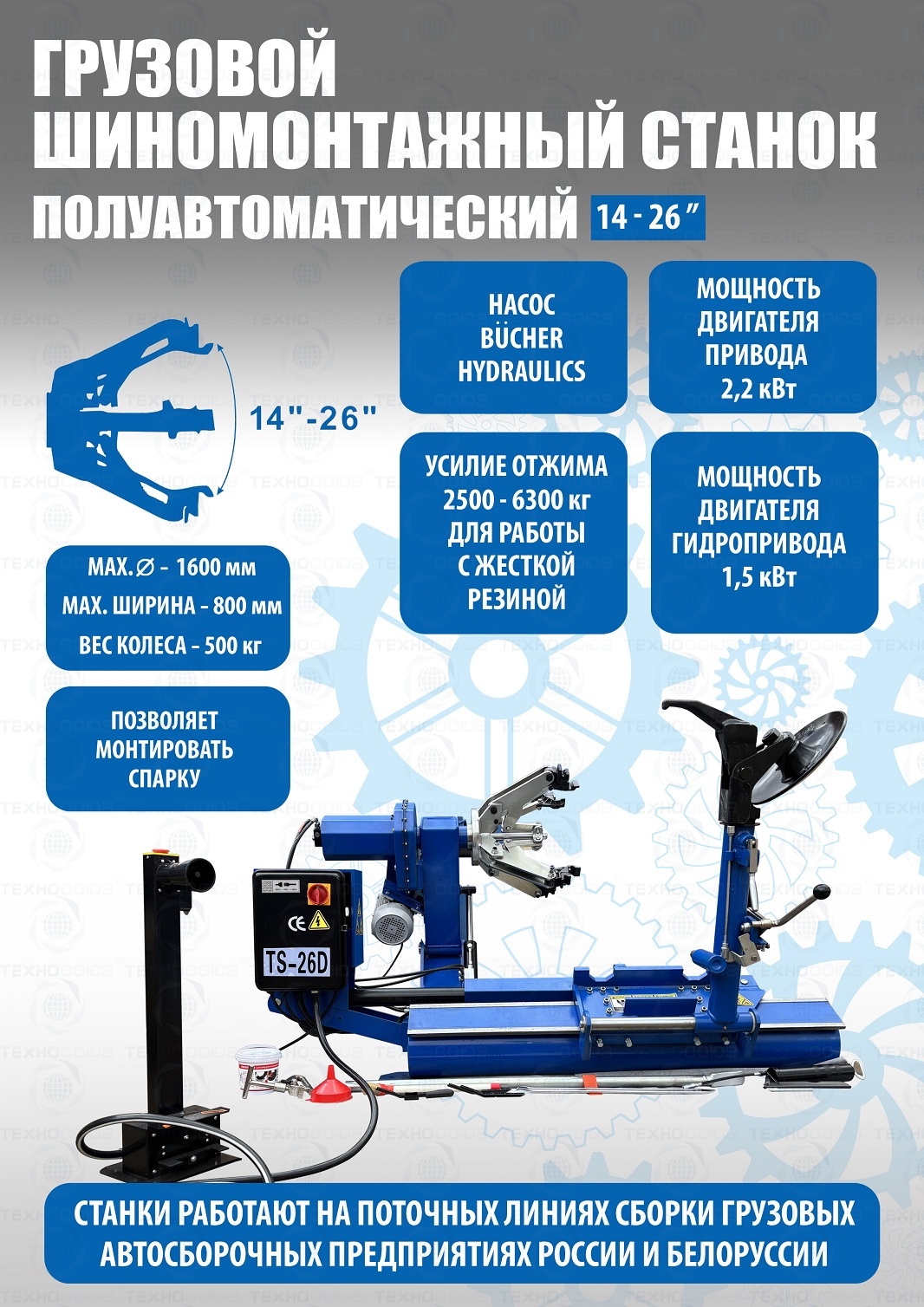 полуавтоматического грузового шиномонтажного станка TS-26D. Отказов и рекламаций нет!!!  Диски сталь, AL, с кольцами и без, 14÷26” с адаптерами 14÷42”, Колесо макс. Ø1600 ширина 780мм, до 500кг. Моторы 1,5 + 2,2кВт. Гидравлика – немецкая «BUCHER HIDRAULICS». Гарантия до 18мес.