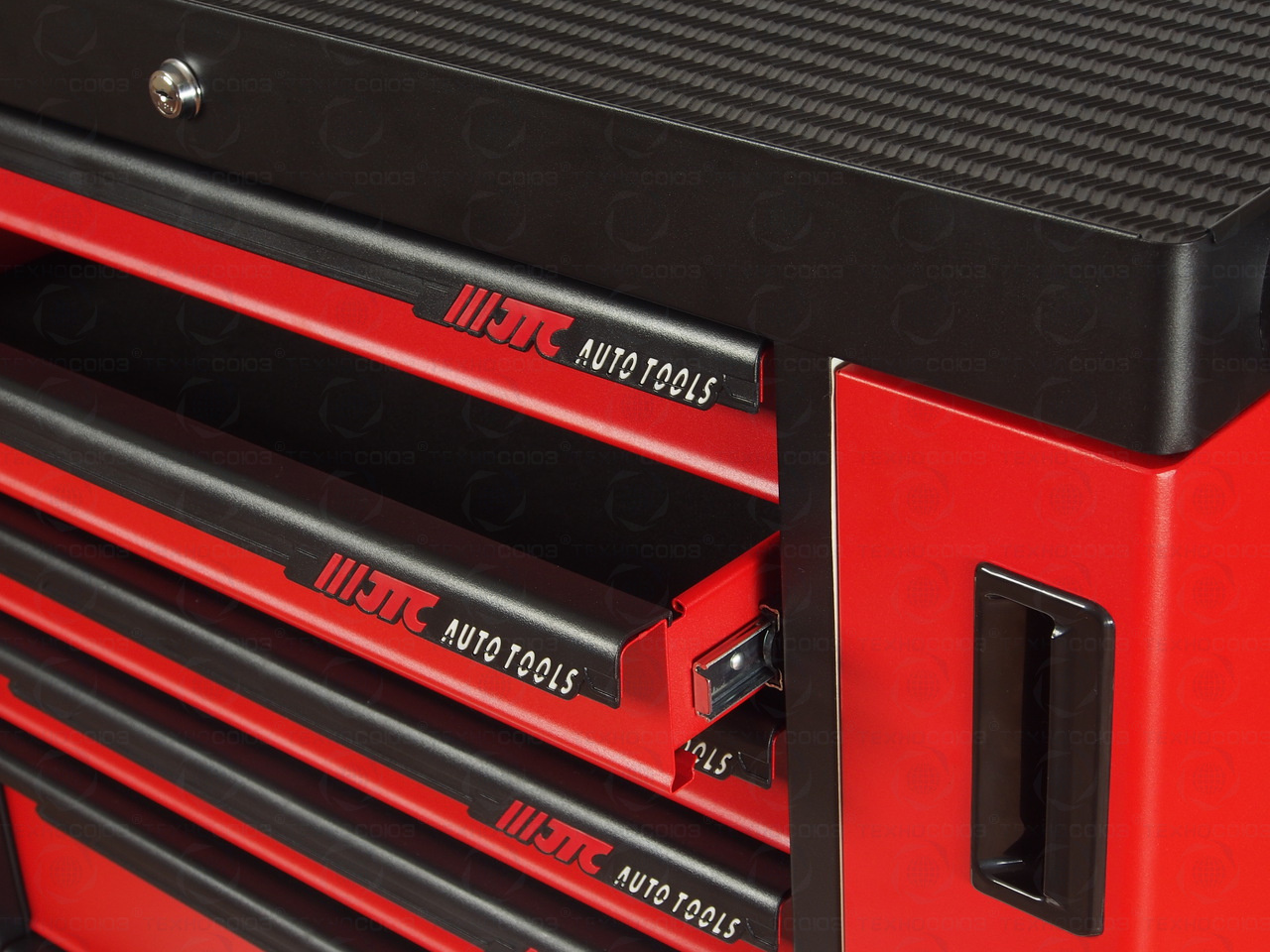 • Перфорированные внутренние стенки боковых ящиков с квадратными отверстиями предоставляют возможность разместить дополнительные аксессуары для хранения инструментов. Применяется с серией подвесных приспособлений JTC-3218.