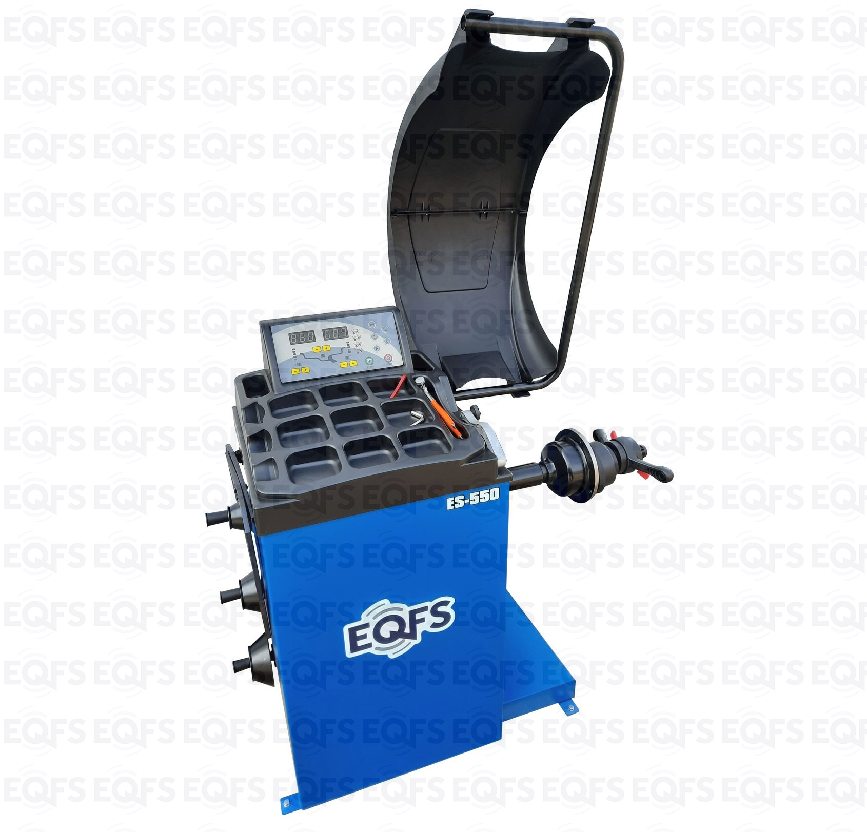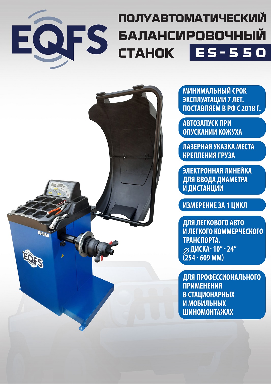 ES-550 Балансировочный станок. Полуавтомат. Удобный и понятный интерфейс. Автозапуск опусканием кожуха. Автоматический ввод дистанции и диаметра диска. Лазерная навигация. Автокалибровка. Для колес легковых автомобилей, мотоциклов, «Газелей», «Спринтеров» с диаметром диска с резиной до 800 мм. Размеры диска: ширина 3–10” (76-254 мм) , диаметр диска 10–24” (254÷609 мм). Вес ≤ 65 кг. Вал- 36 мм. Точность ±1гр. 220 В. Режимы работы DINAMIC, STATIC, ALU1, ALU2, ALU3, ALUS, ST. Гарантия 12 мес. В комплекте: кожух с автозапуском + клещи + кронциркуль + быстрозажимная гайка + набор конусов.