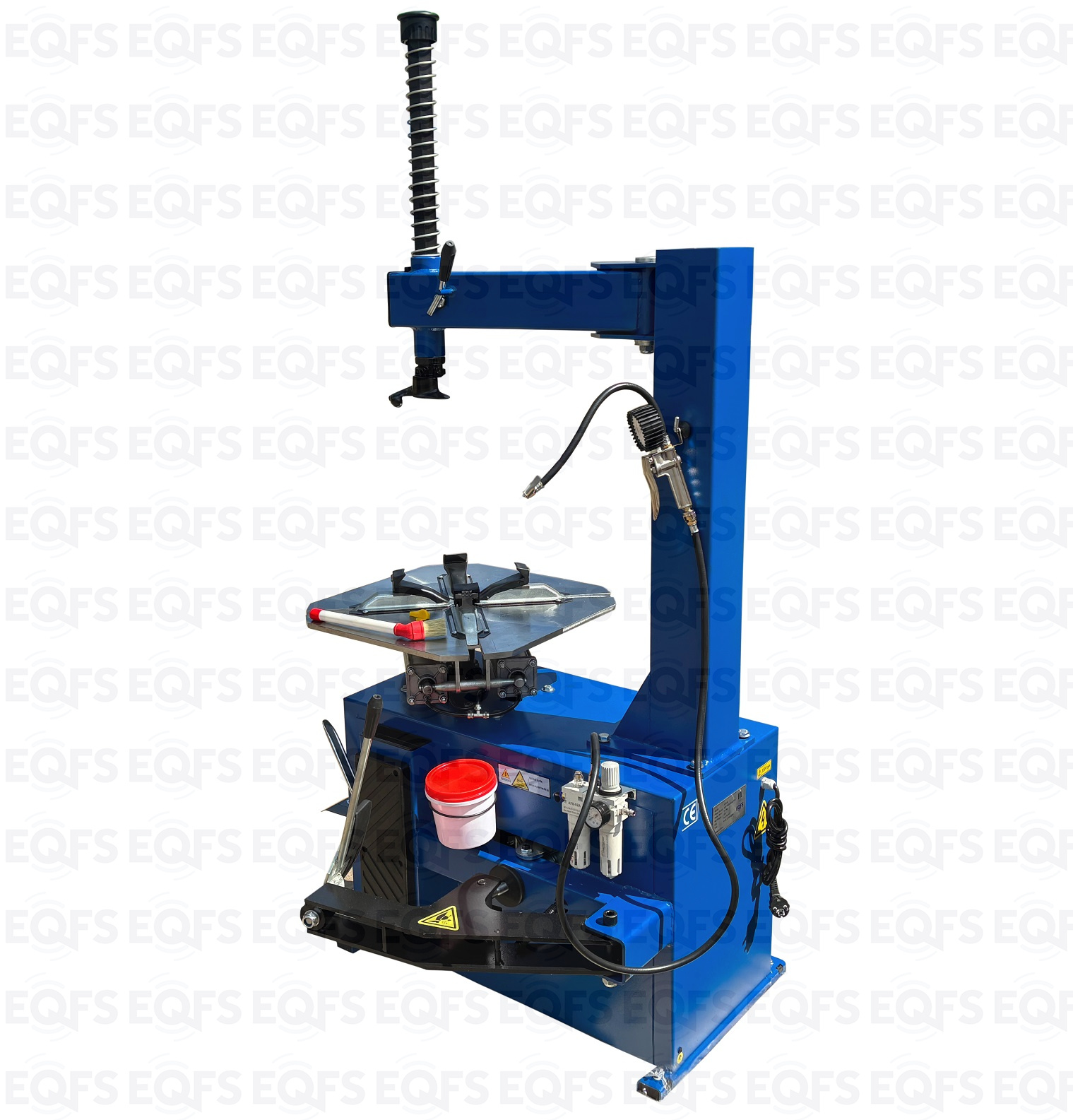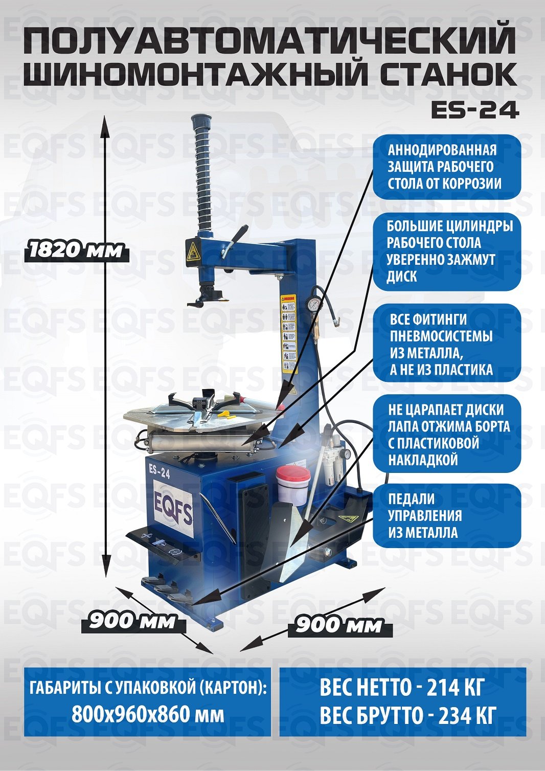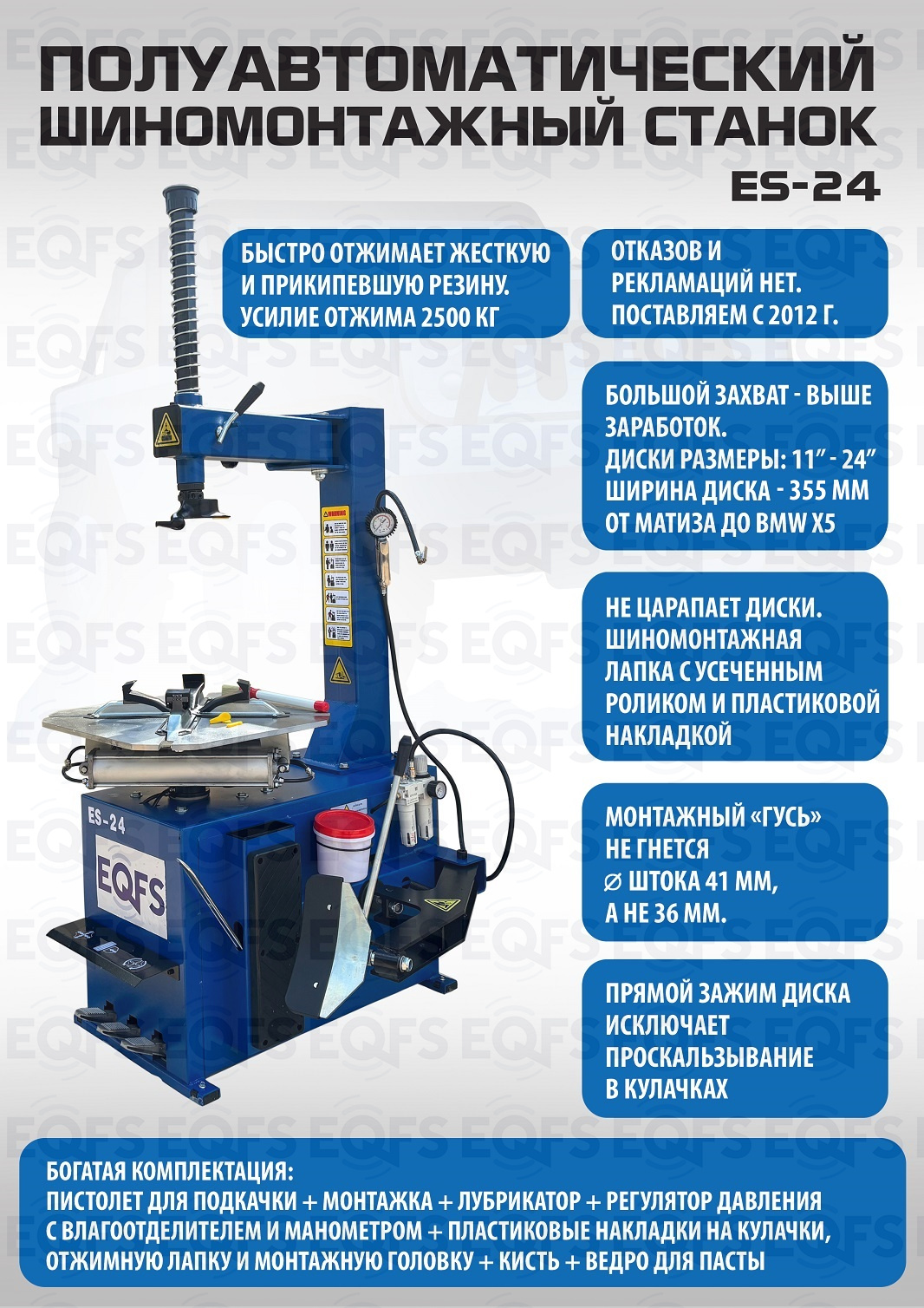 ES-24 Станок шиномонтажный полуавтоматический 11-24"дюйма. Усилие отрыва покрышки 2700 кг. В комплекте: пистолет для подкачки шин + монтажка + пластиковые накладки на зажимные кулачки + регулятор давления с влагоотделителем и манометром. Электропитание на 220В или 380В.