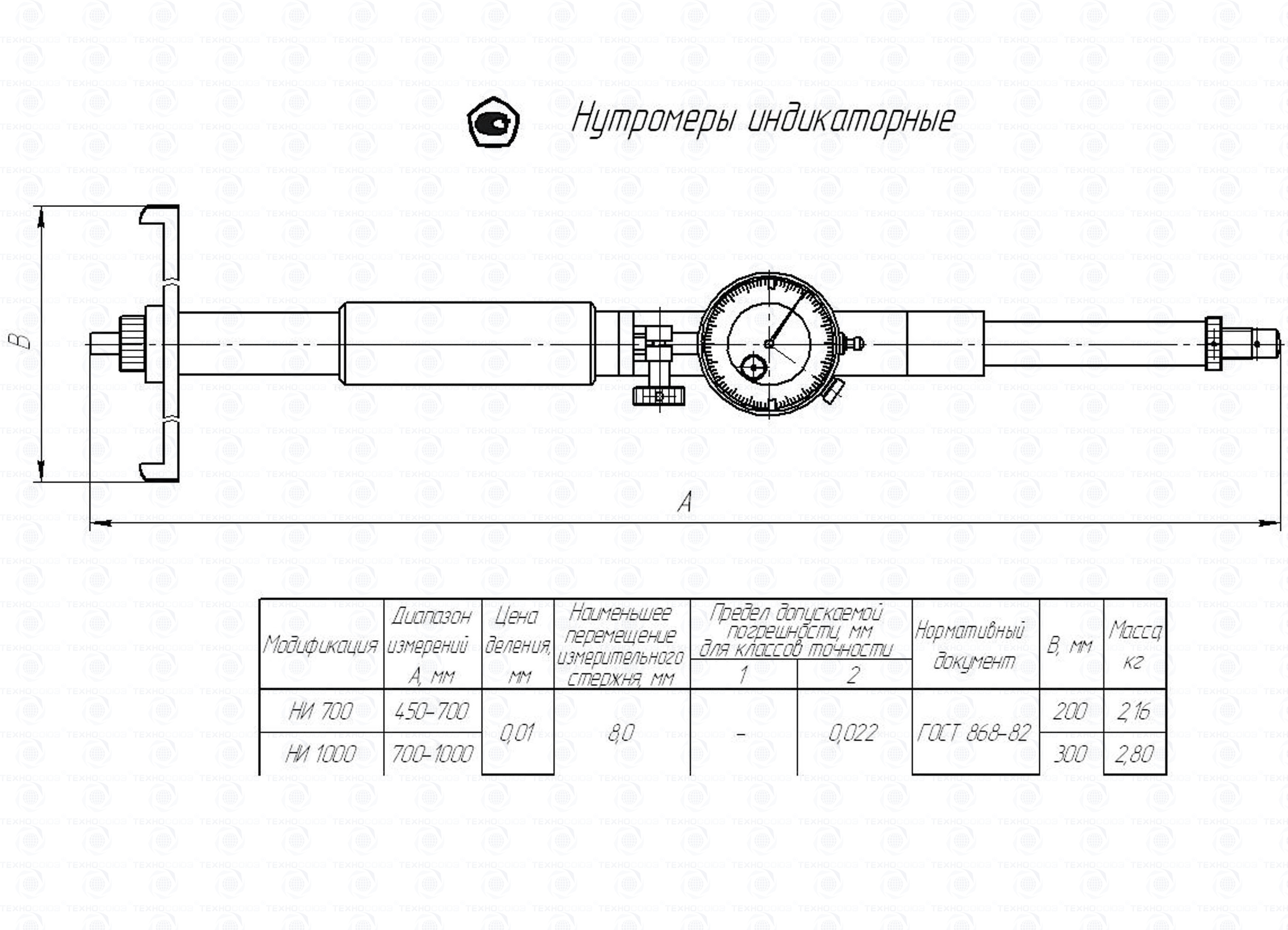 Нутромеры индикаторные с ценой деления 0,01 мм. Предназначен для измерения внутренних размеров от 450 до 700 мм. В нутромерах НИ 700 и НИ 1000 подвижный измерительный стержень контактирует непосредственно с отсчетным устройством. Измерительные поверхности стержней оснащены твердым сплавом. Класс точности 1. ГОСТ 868-82. Поставляется в двух вариантах с поверкой и без поверки!