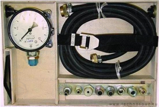 Прибор состоит из манометра(предел измерения 0-10 кгс/см2, класс точности 1,5, ГОСТ 2405-88).
