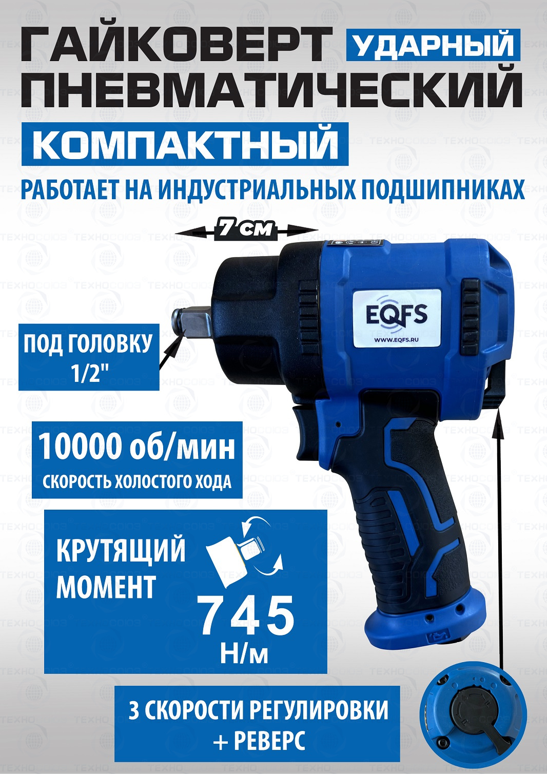 + ударный пневмогайковерт. КОМПАКТНЫЙ КОРПУС позволяет работать в ограниченном пространстве. Устойчив к перегрузкам - работает на индустриальных подшипниках. Ударопрочный - изготовлен из морозо/ударо- устойчивого пластика (облегченный композитный корпус) - ВЕС-1,37 кг. Обрезиненная рукоятка. Реверс, регулировка крутящего момента – 3 режима. Под головку 1/2”. Крутящий момент 745 Нм. Высокая скорость - 10 000 об/мин.