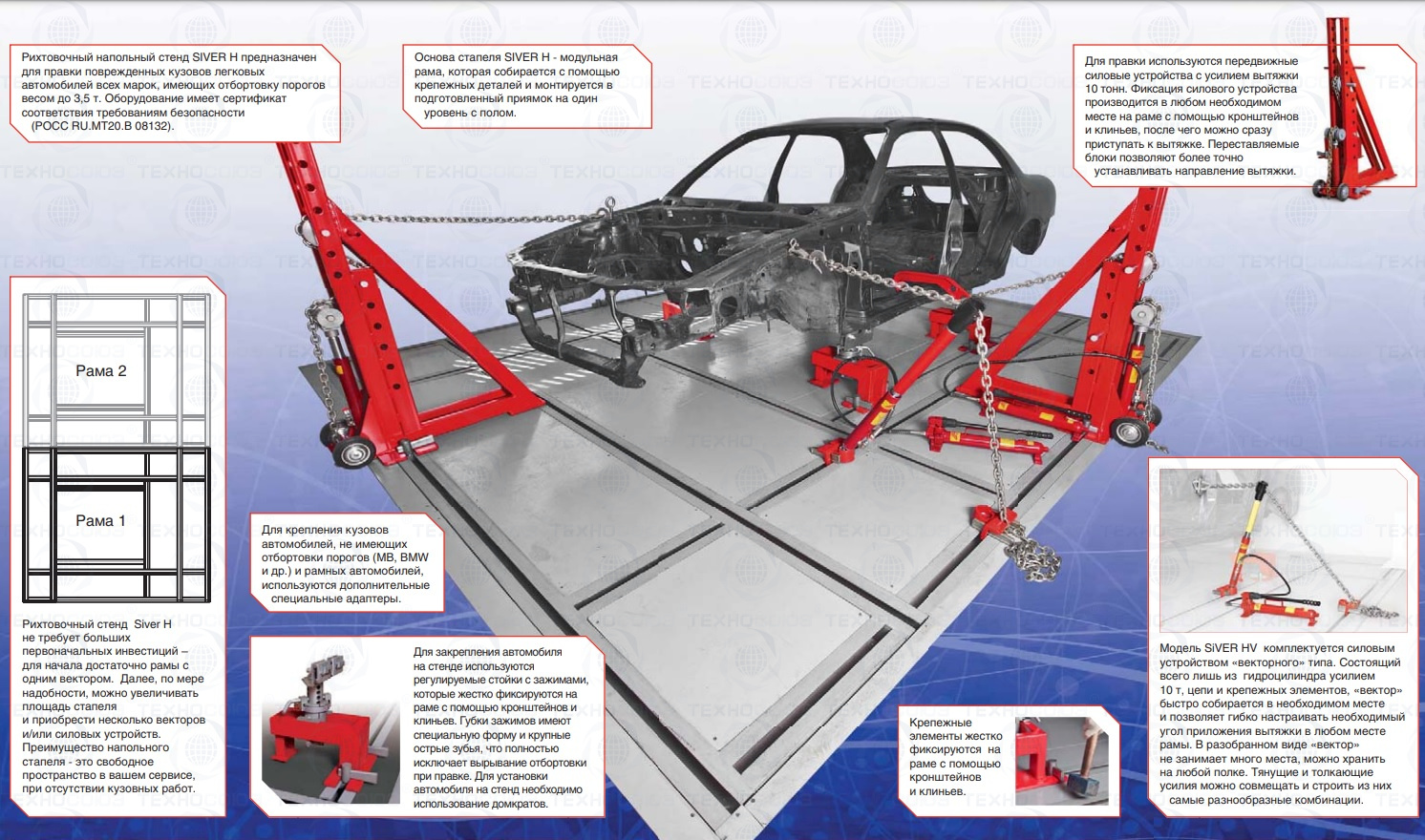 Для правки кузовов используются передвижные силовые устройства с усилием вытяжки 5 или 10 тон. Фиксация силового устройства производится в любом необходимом месте на раме с помощью кронштейнов и клиньев, после чего можно сразу приступать к вытяжке.