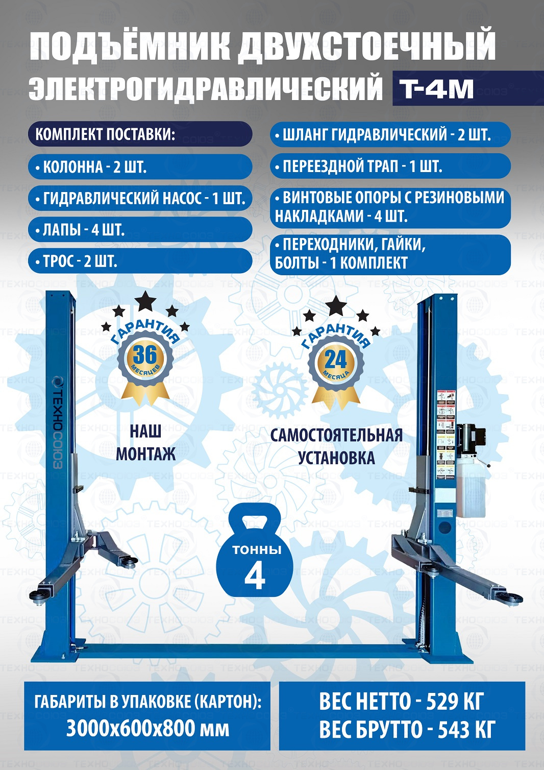 Гарантия 36 мес – наш монтаж, 24 мес – самостоятельная установка. Срок службы – не ограничен. Поднимает ВСЁ – от «Оки» до «LC200». Съем со стопоров – ручной. Тросом на каждой колонне. Передние лапы изогнутые (715-1041 мм) складываются по ходу движения авто, задние лапы (905-1451 мм)  - не нужно прокатывать вперёд/назад. Мотор 2,2кВт. 220/380В. Высота подъёма 110÷1930 мм. г/п - 4 тонны.