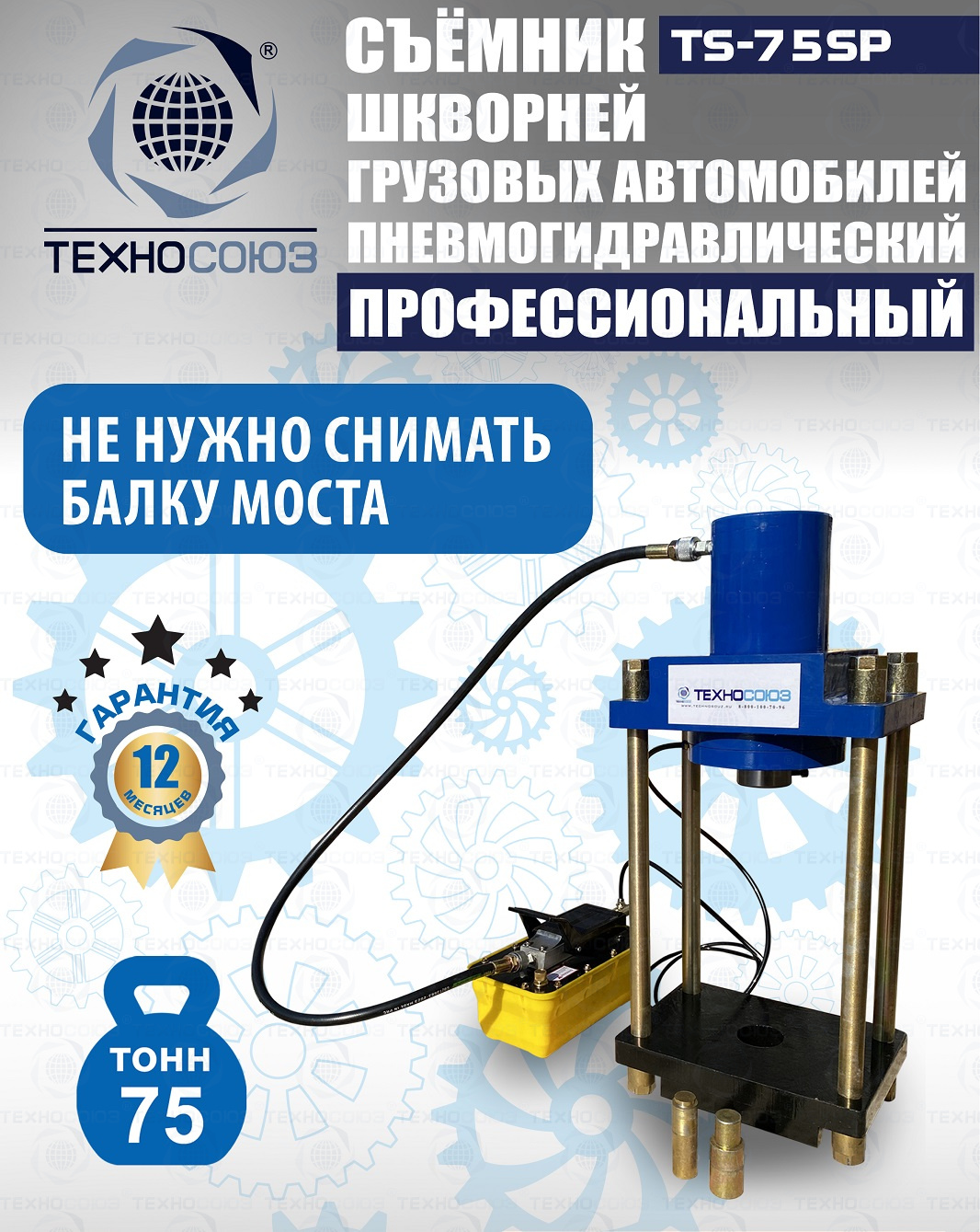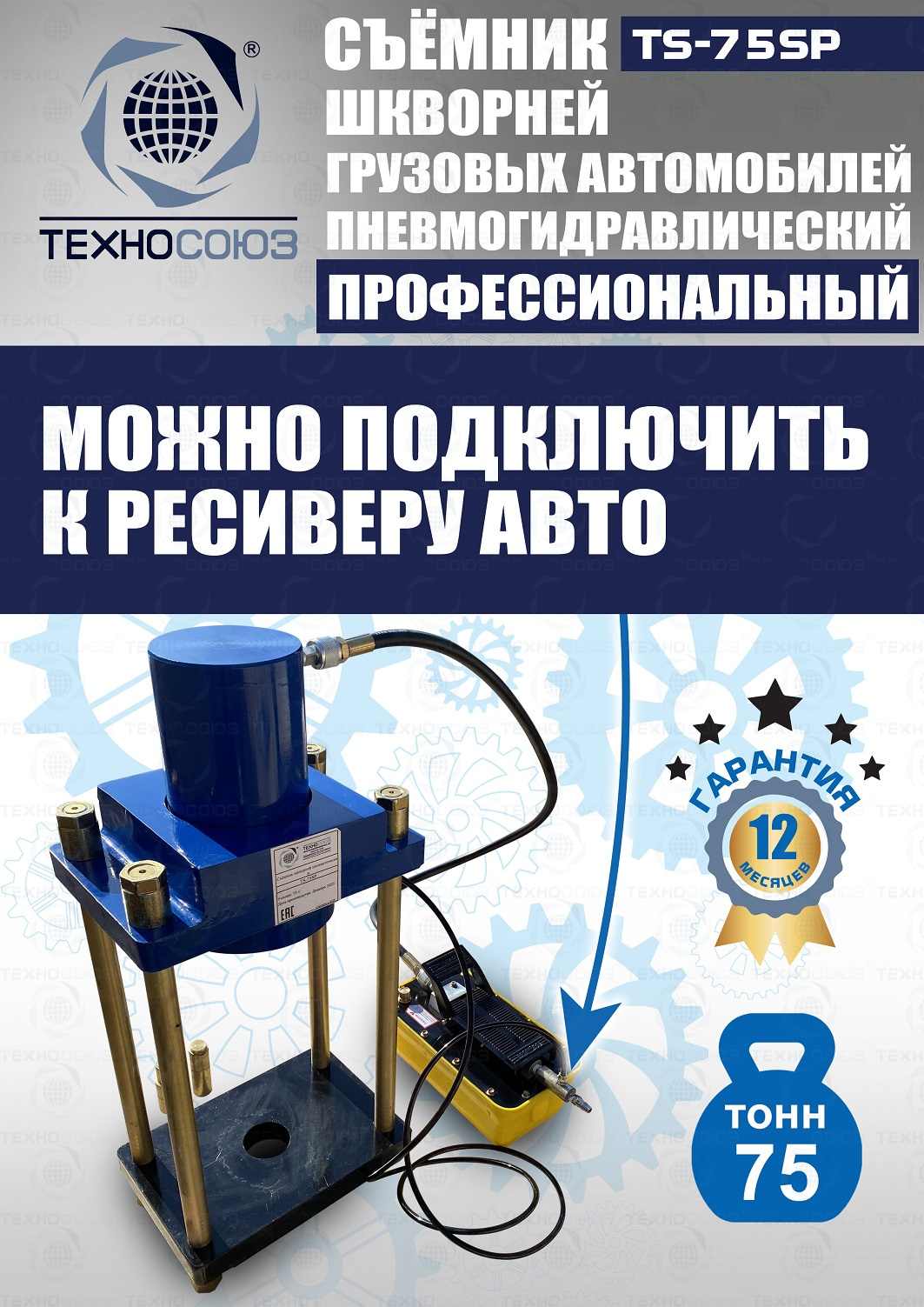 Сокращает время ремонта. Позволяет работать под разными углами. Для выпрессовки шкворней из поворотной цапфы погрузчиков, тракторов, строительной техники, коммерческих и грузовых авто отечественного и импортного производства: MAN, MERCEDES, SCANIA, VOLVO, Корейские и Китайские авто. Пневмогидравлический привод. Рабочее окно 400x320 мм. Усилие 75 тонн.